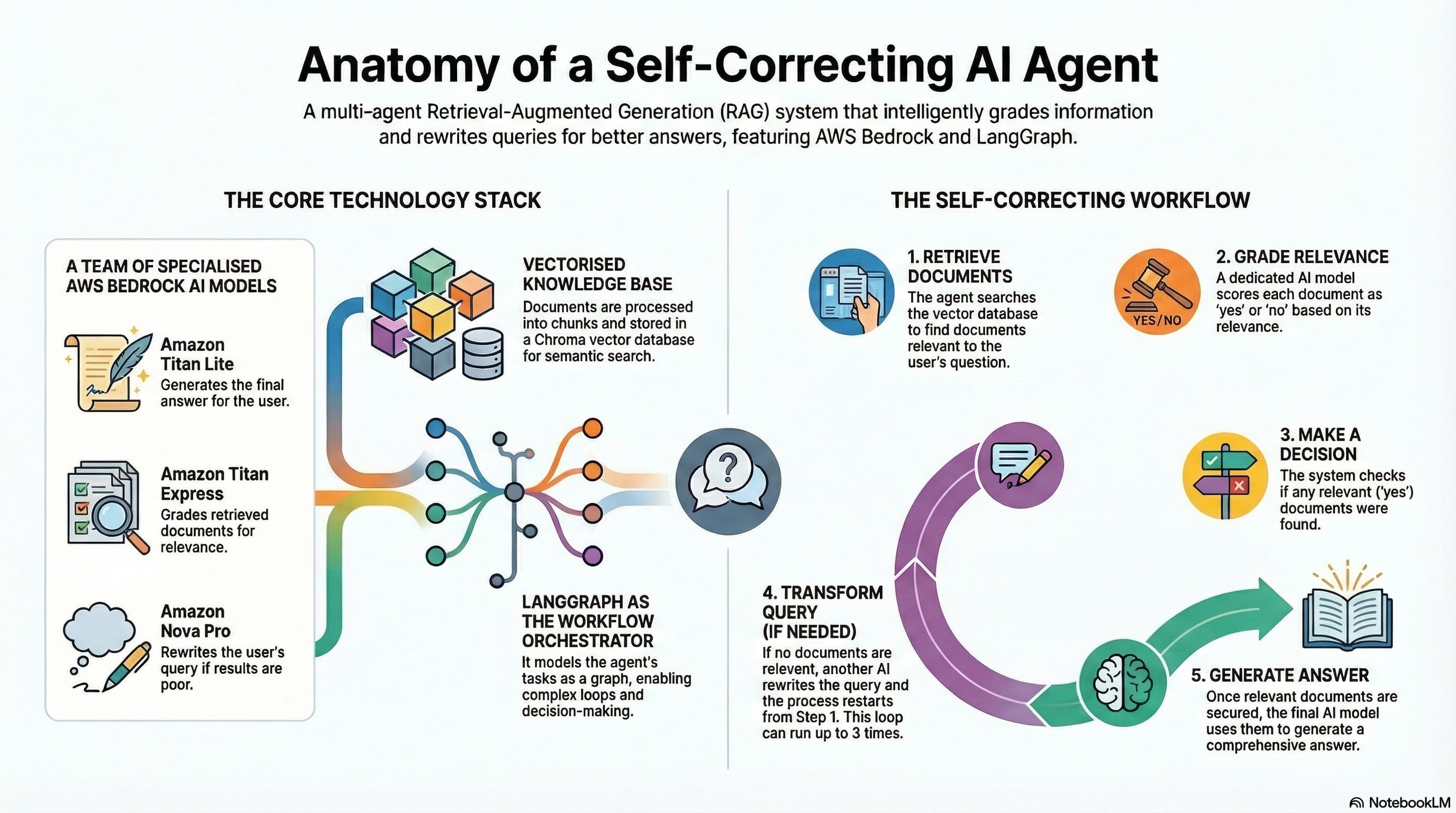 LangGraph’s state-based workflow orchestration creates adaptive AI agents that automatically retry and transform queries up to 3 times when initial document retrievals fail to meet relevance thresholds, ensuring robust error handling and query optimization. This Multi-Agent architecture3 integrates Chroma vector database with Amazon Titan embeddings for document search, processing agent-related articles into 250-token chunks for optimal retrieval performance in RAG applications.